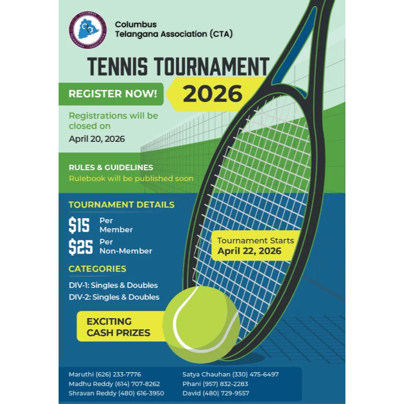 Hello Columbus, CTA is excited to host our next Sports event of 2026 — a Tennis Tournament! Join us to compete, have fun, and connect with fellow members. Register here: https://www.zeffy.com/en-US/ticketing/tennis-tournament-2 (Select “Other” at checkout to pay the exact amount) Looking forward to seeing you all! — CTA Sports Team